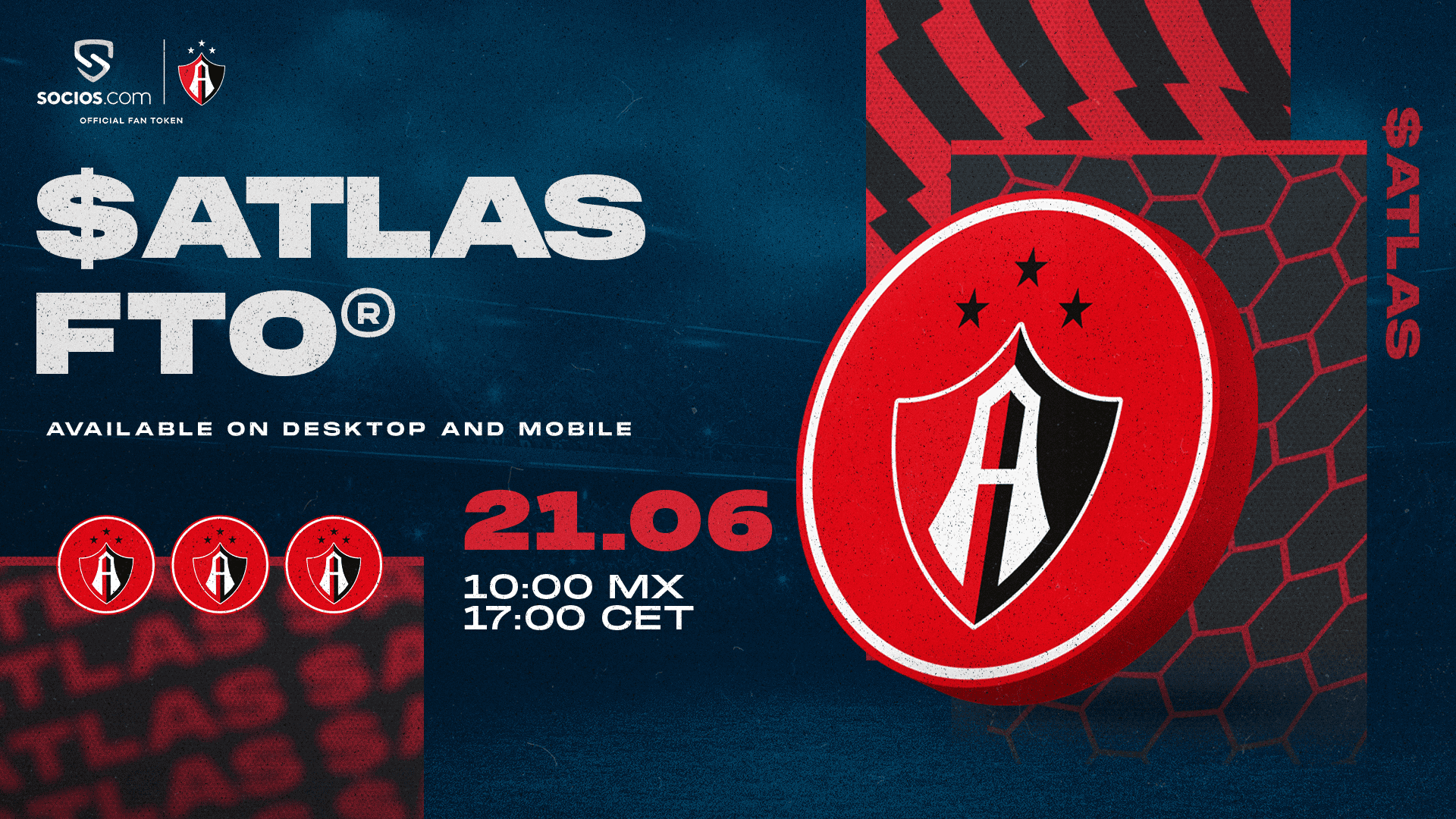 100.000 $ATLAS Fan Tokens will be made available on the Socios.com app at 10.00 am (Mexican time) on June 21st at $2 USD each through a Fan Token Offering (FTO®) that will span 24 hours across three different waves in which the number of Fan Tokens per user will be capped to ensure as many Atlas FC fans as possible can access this new opportunity.