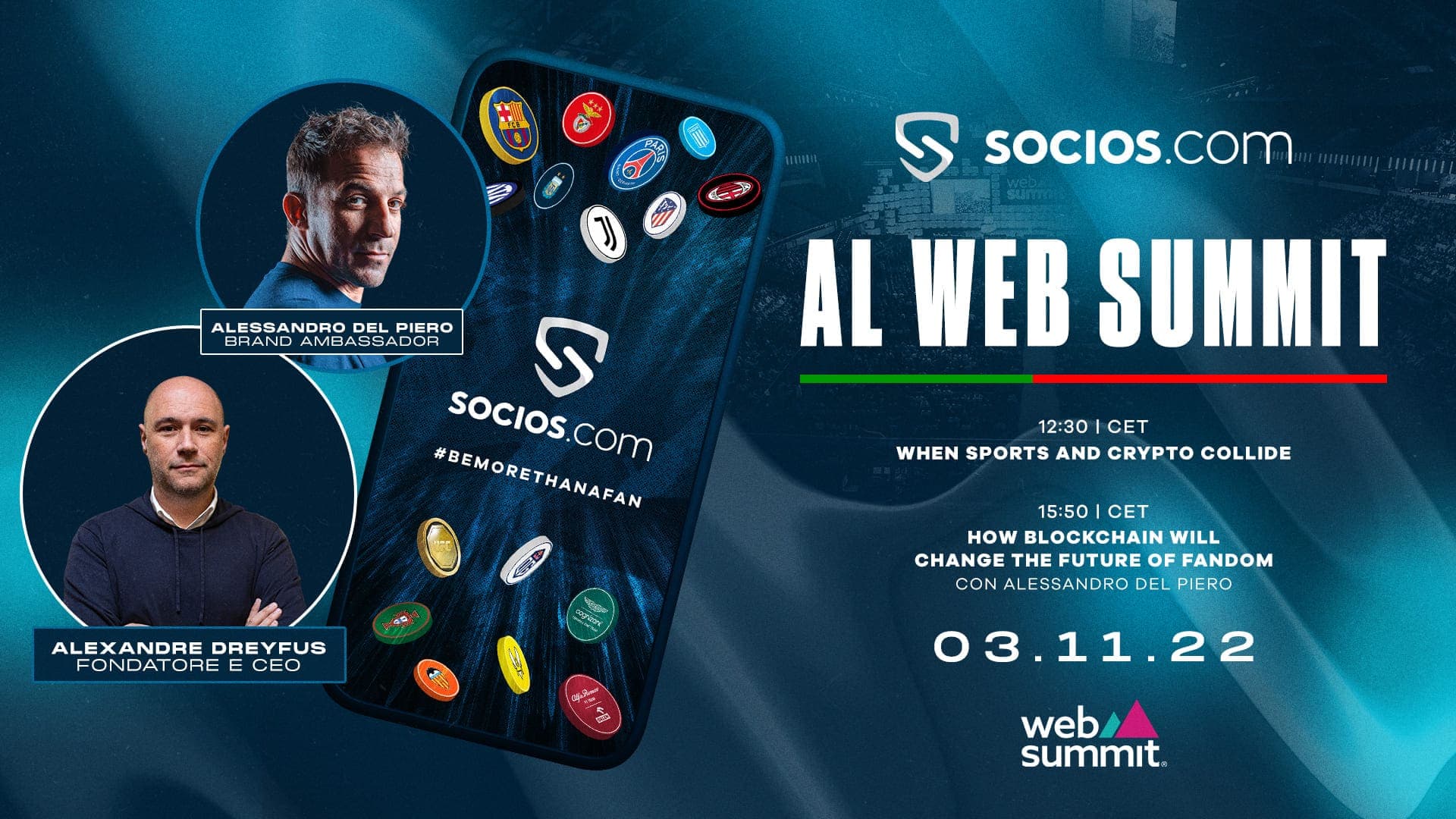 Alle 15:50 (orario CET), Alex e Alessandro prenderanno la parola sul palco centrale dell’Altice Arena di Lisbona per rivolgersi a un pubblico di personaggi di rilievo del mondo tech a livello mondiale per illustrare il ruolo centrale di Socios.com e dei Fan Token nella creazione di un’esperienza più coinvolgente e più gratificante per i tifosi.
